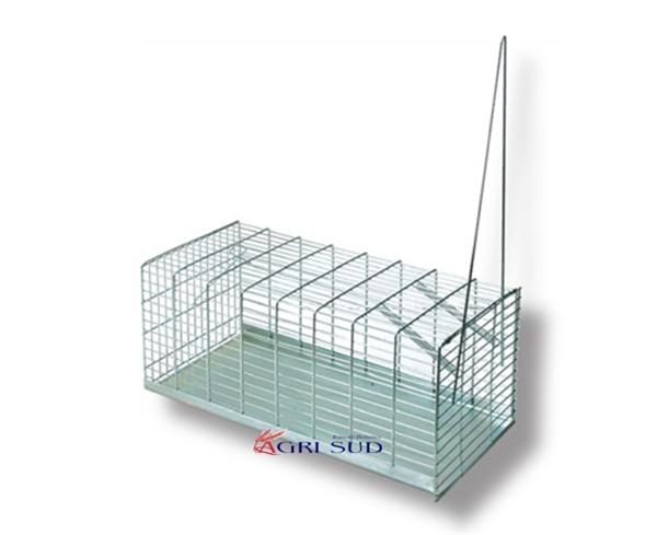 Trappola a gabbia per topi, in ferro zincato. Il portello di chiusura è direttamente collegato al sistema di puntamento ad esca.